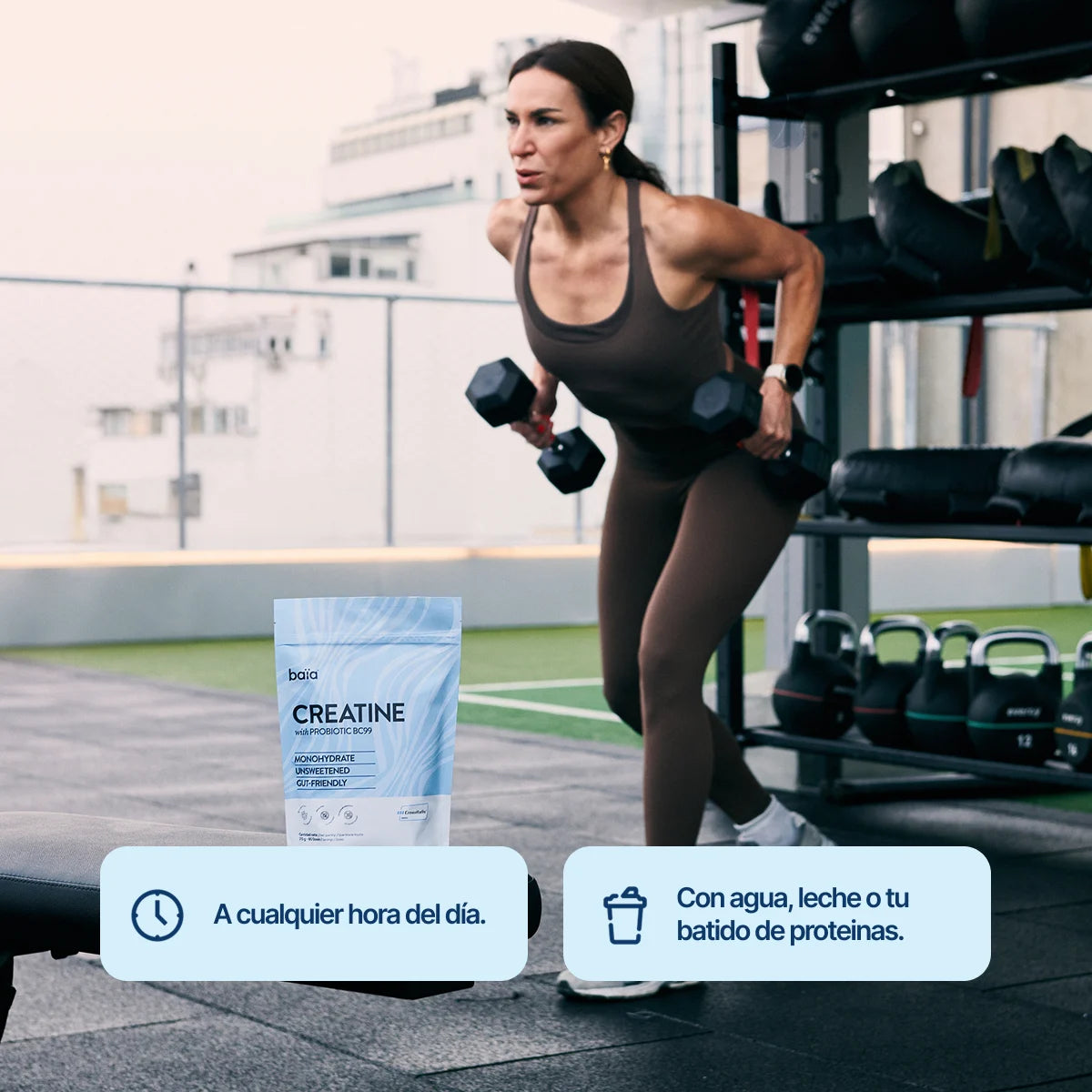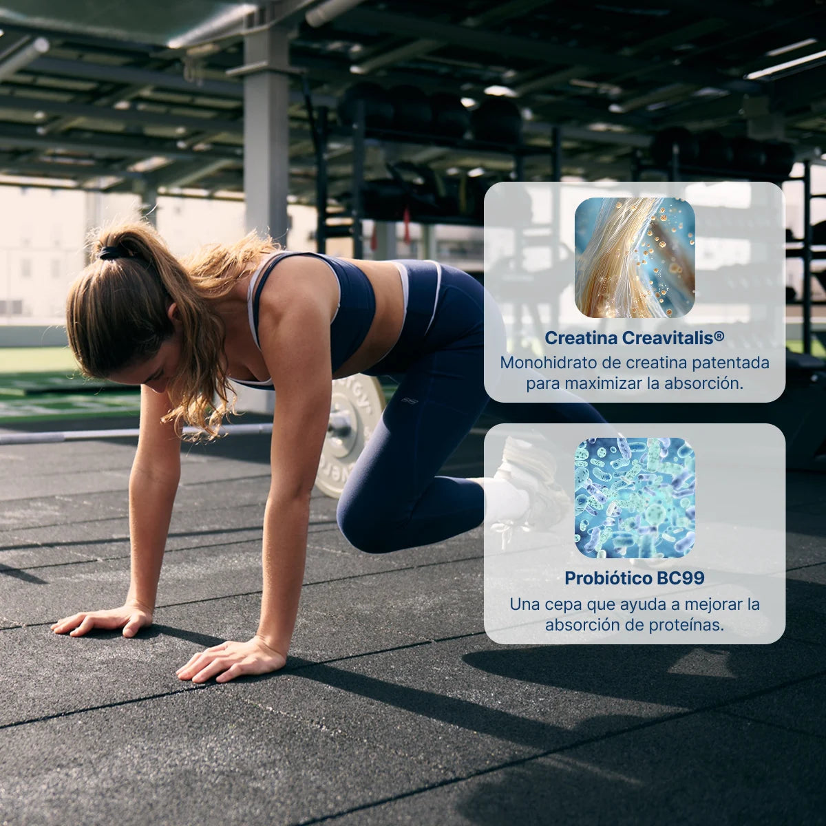Para periodos de alta exigencia y etapas de cambio en la vida (como la menopausia), donde la fatiga física afecta al bienestar general. Nuestra fórmula única combina la energía aportada por la creatina con el probiótico BC99, ayudándote a mantener el ritmo pase lo que pase.