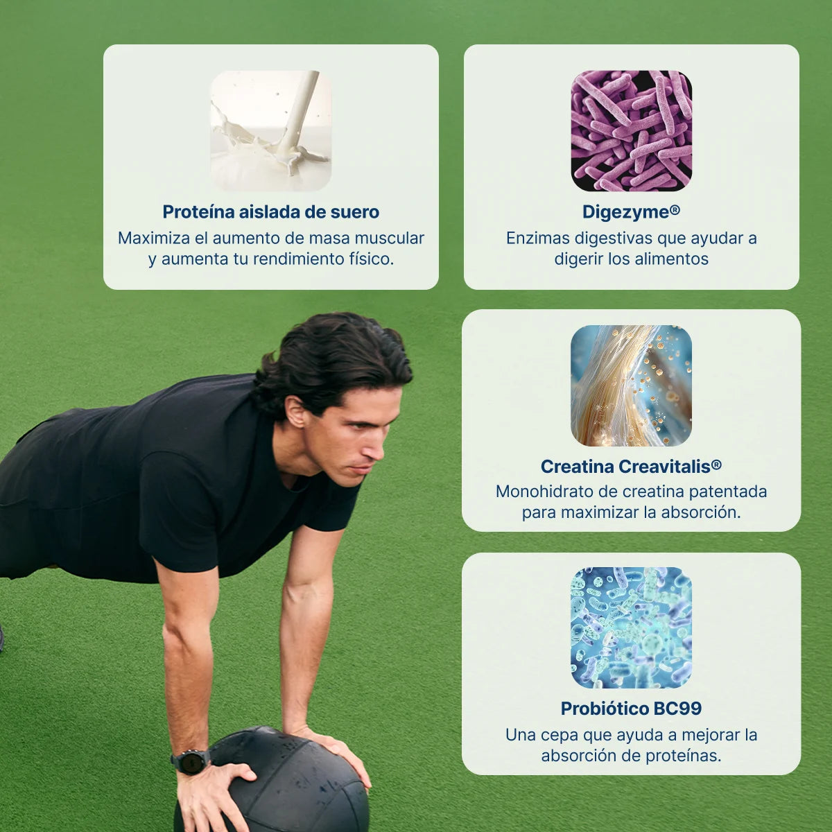 El cambio empieza por dentro. Gracias a las enzimas DigeZyme®, notarás que tu batido se siente ligero desde el primer día, sin la pesadez típica de otras proteínas. Mientras, el probiótico BC99 trabaja en sinergia para favorecer la absorción. No se trata solo de nutrirte, sino de sentirte con el estómago ligero y preparado para moverte.