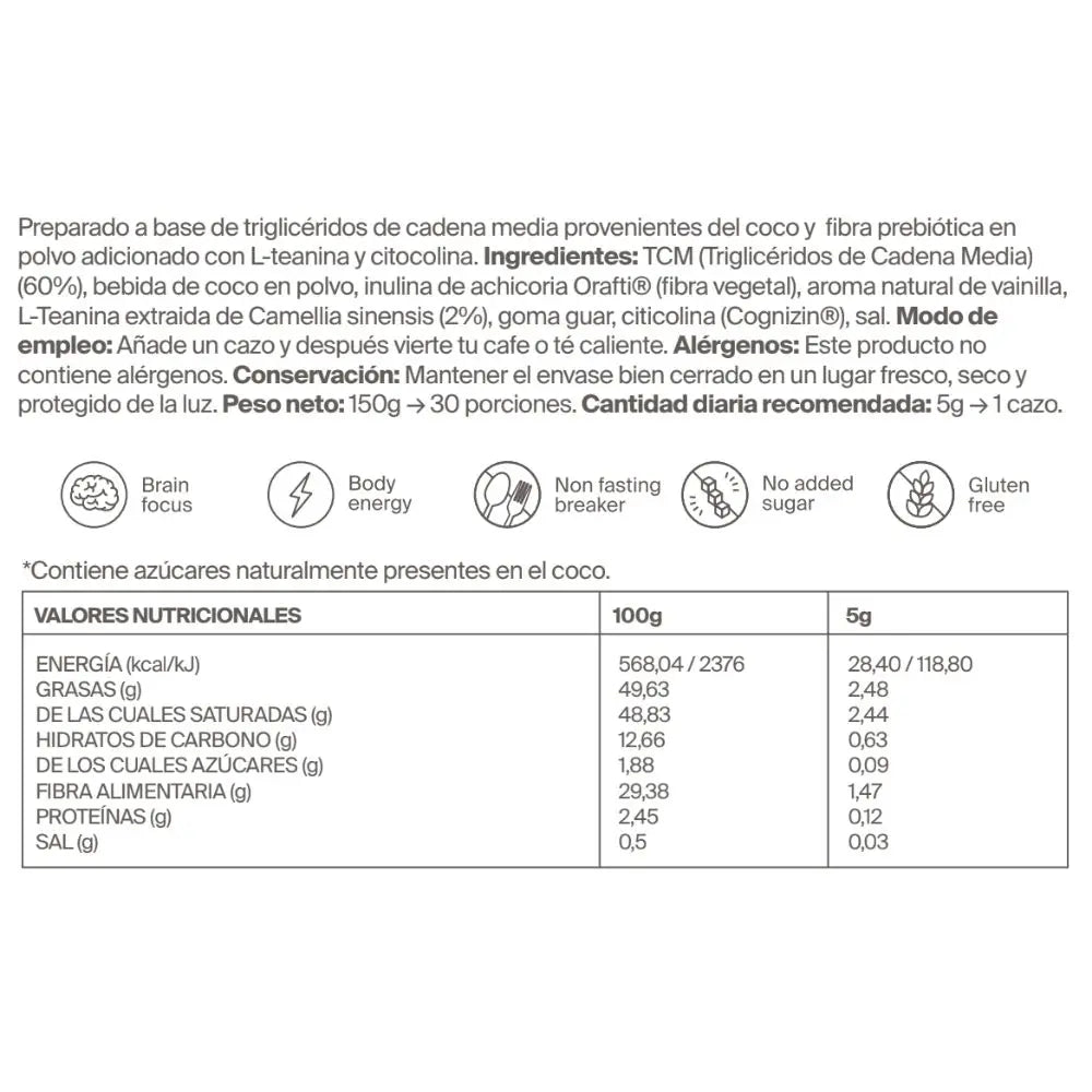 Con citicolina, l-teanina y TCMs del coco. Sin lactosa, sin azúcar ni edulcorantes.
