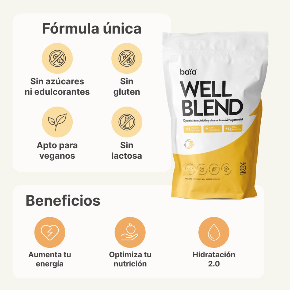 La combinación de fibras y polifenoles derivadas de la fermentación de 40 especies vegetales no solo favorece una mayor diversidad microbiana, sino que también reduce la inflamación intestinal, incrementa las Bifidobacterias y regula el tránsito intestinal. Estos efectos sinérgicos hacen que el Well Blend sea una opción efectiva para promover la salud intestinal y mejorar el bienestar digestivo general. (5,8).