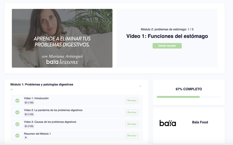 "Llevo muchos años con problemas de estómago y no sabía lo que me pasaba. Llega un punto que es frustrante comer sano y que todo te sienta mal. Últimamente había oido hablar desl SIBO y por eso me apetecía ver este curso. La verdad es que me ha sorprendido muchísimo. Mariana es una profesional muy crack que explica perfectamente qué puede estar pasando en tu digestión y cómo solucionarlo. Ahora ya se que aunque coma sano, si tengo alguna patología tengo que abordarla primero. Recomiendo mucho este curso". - María